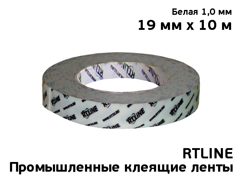 Двухсторонняя клеящаяся лента RTLINE шириной 19мм, толщиной 1мм, в намотке 10м с основой из вспененного полиэтилена белого цвета и сильным клеящим слоем. Подложка из зеленой силиконизированной бумаги.