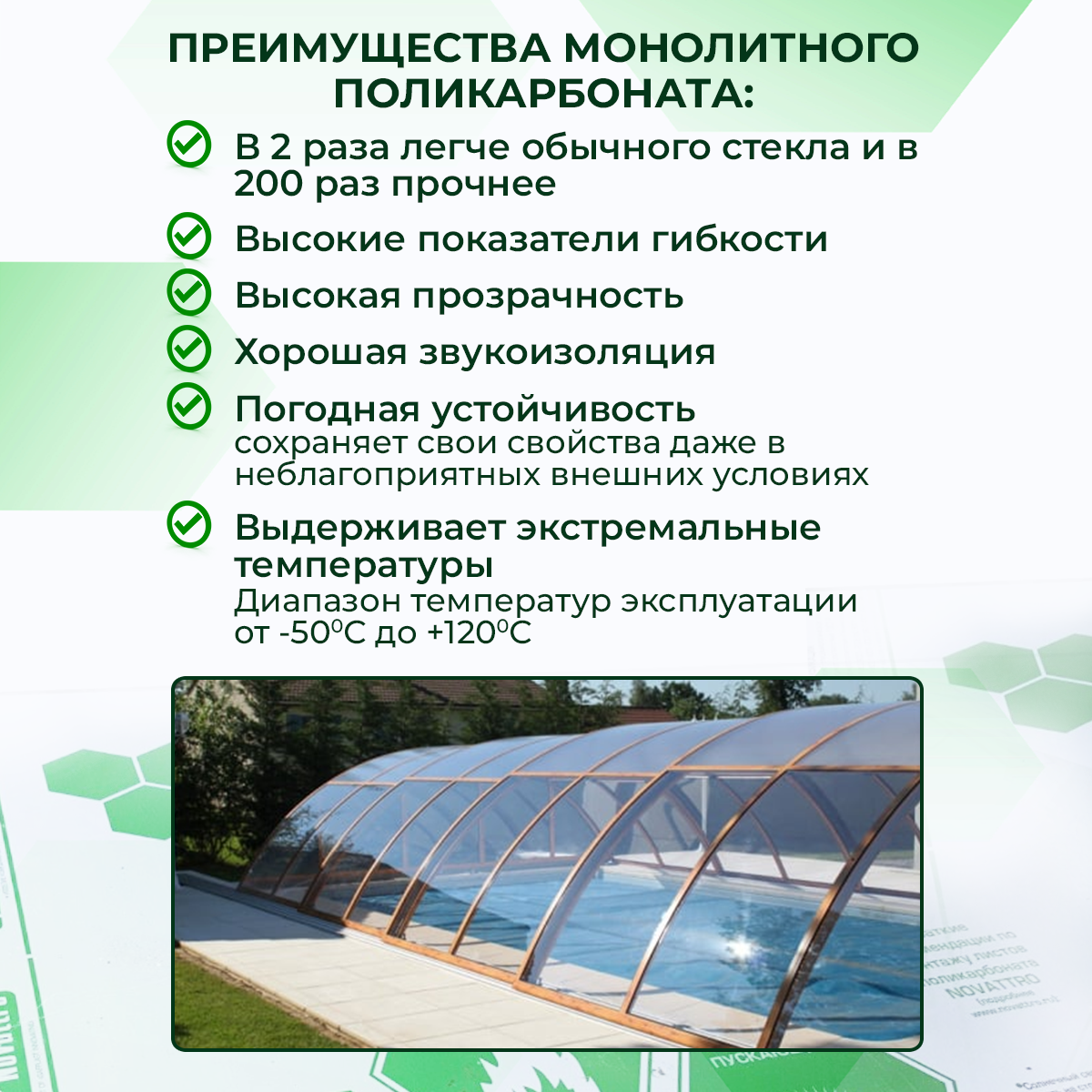 - погодная устойчивость - листы монолитного поликарбоната годами сохраняют свои свойства даже в неблагоприятных внешних условиях