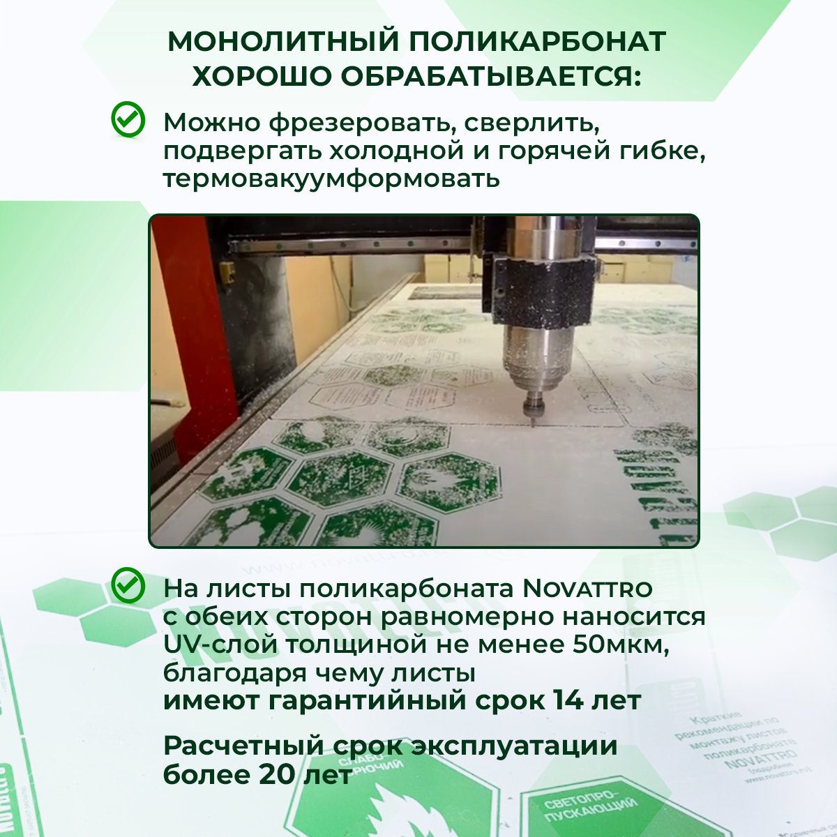 Монолитный поликарбонат Novattro производится с соблюдением всех технологических параметров, необходимых для создания высококачественного материала: используется только качественное сырье от крупнейших мировых производителей Sabic и Bayer; на листы с обеих сторон равномерно наносится UV-слой толщиной не менее 50 мкм, благодаря чему листы Novattro имею гарантийный срок 14 лет. Расчетный срок эксплуатации более 20 лет.