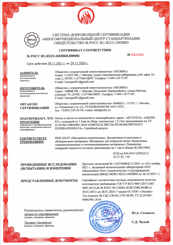 Основные характеристики монолитного поликарбоната ECOVICE 4мм